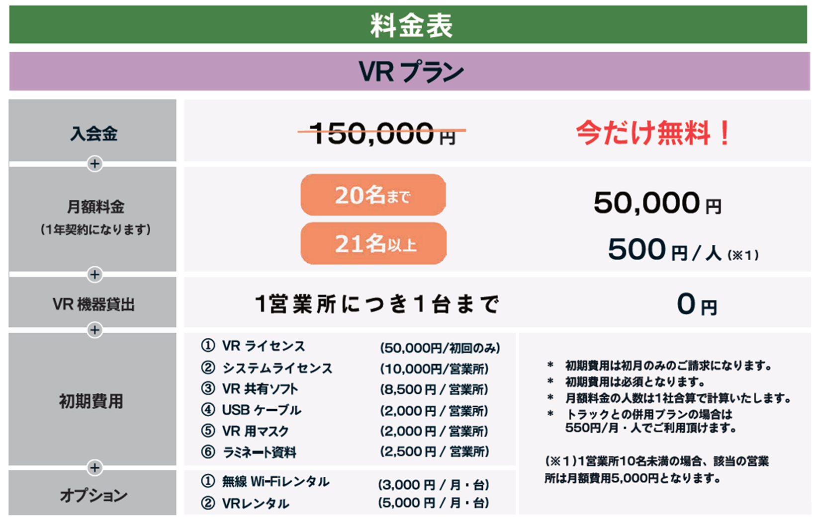 らくらく監査システムの登録人数でカウントしております。そのため、登録を20名に抑えることで、21名以上在籍している事業所様でも50,000円/月でVR動画の使用できます。